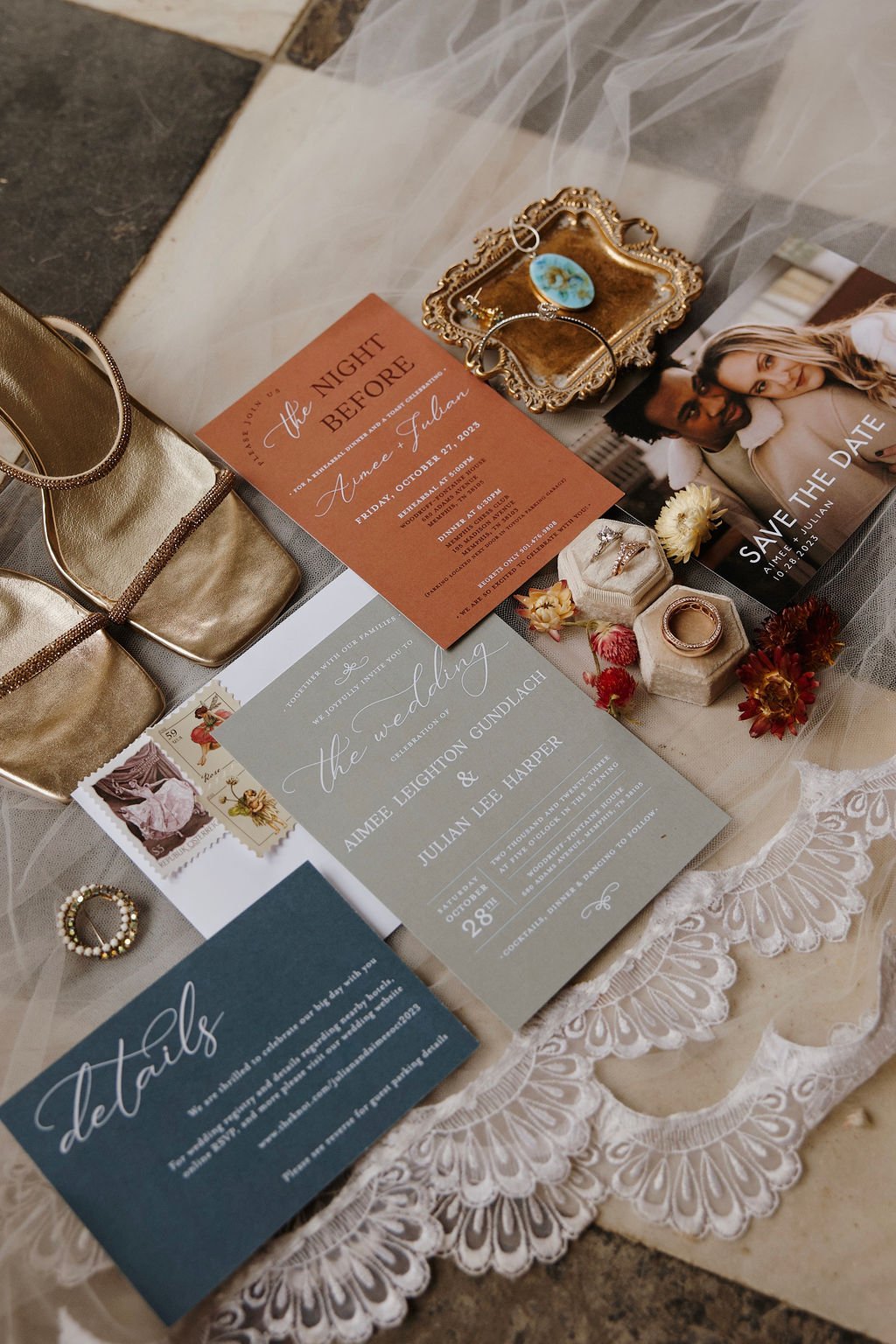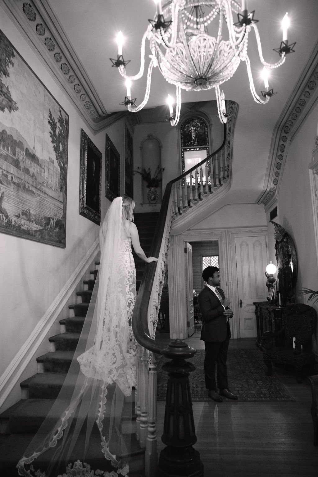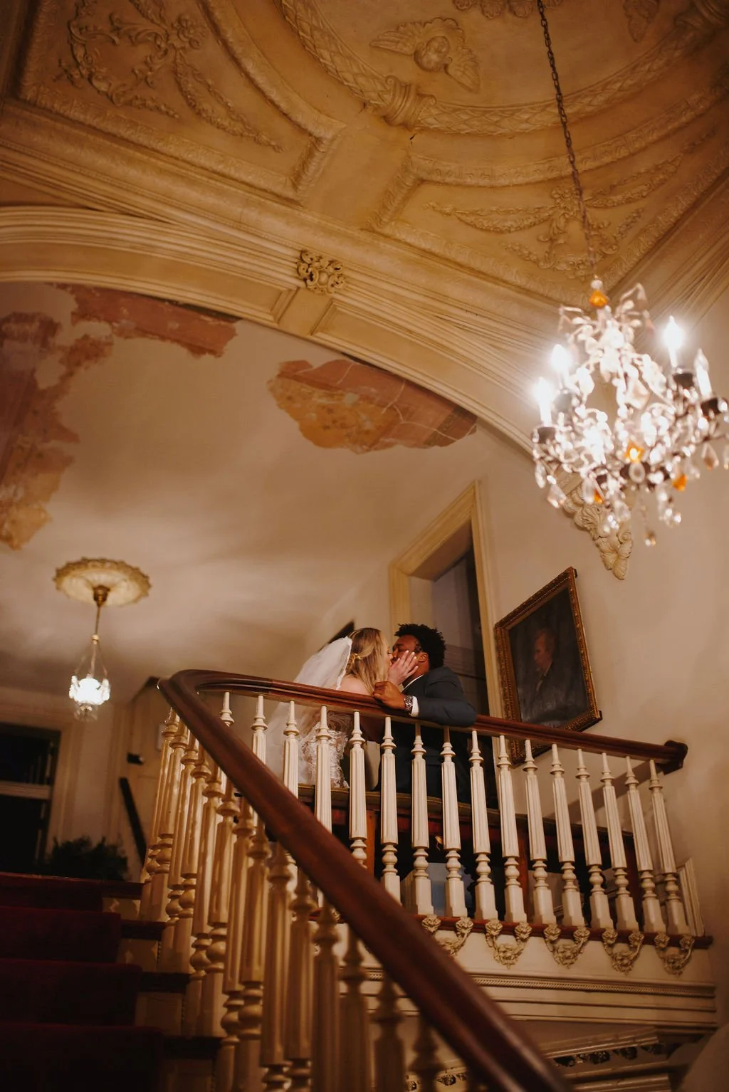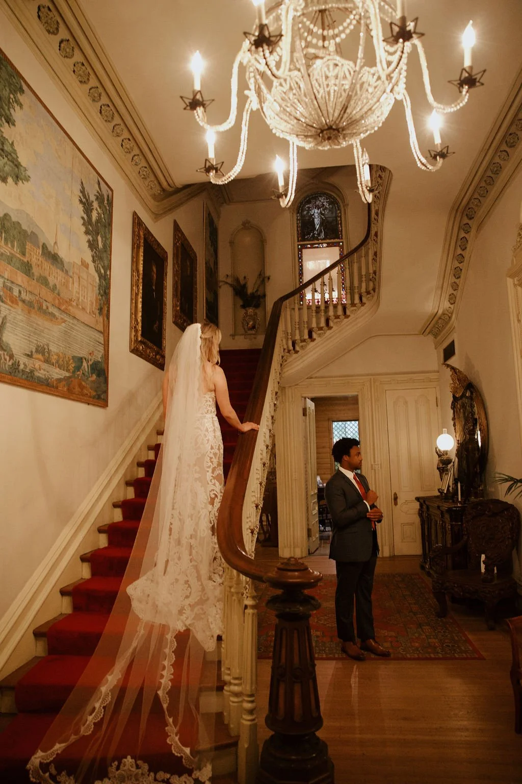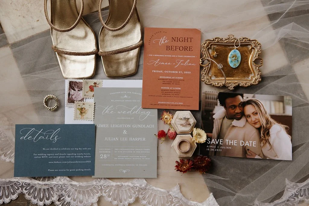 The Woodruff-Fontaine House gave us the most beautiful backdrop — dramatic staircases, ornate chandeliers, and cozy spaces that made the rain feel like part of the story instead of an inconvenience. We even snuck outside between showers for a few portraits, and the wet pavement gave us the prettiest reflections.