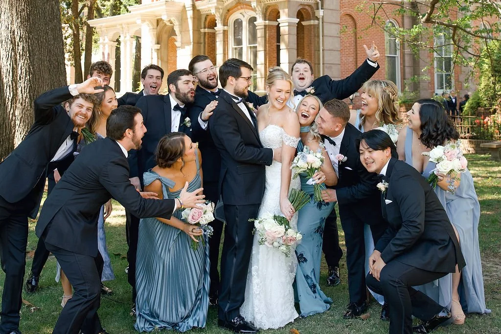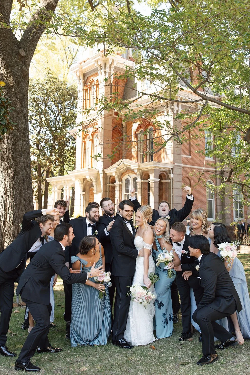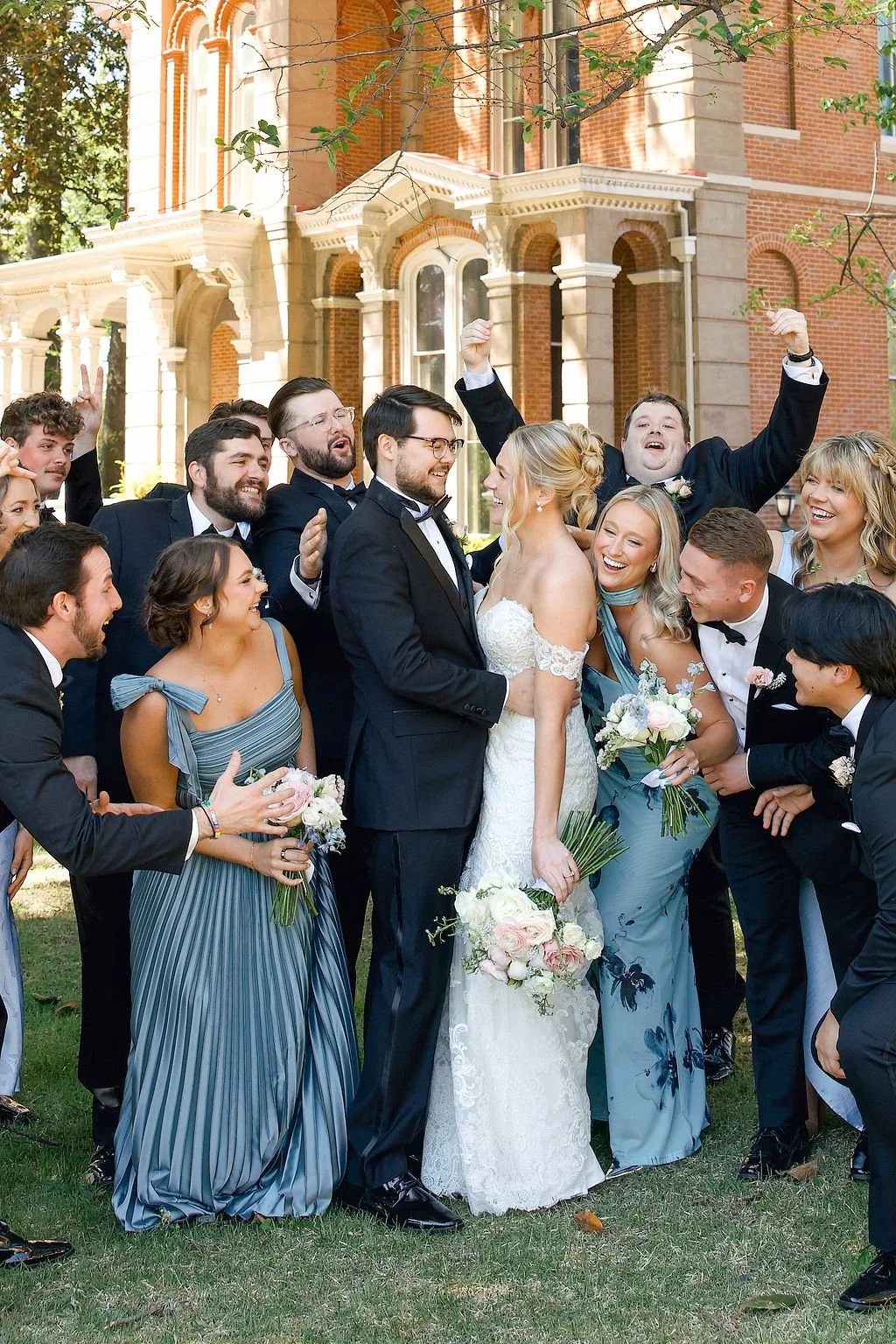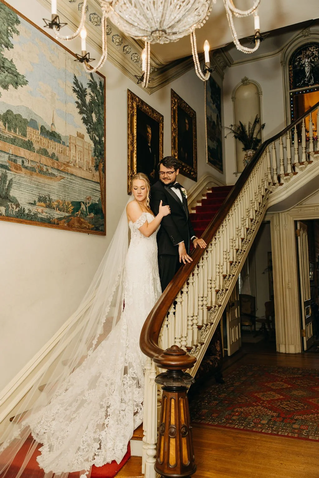After the ceremony, the joy overflowed into portraits and celebrations. Their wedding party brought so much energy and laughter, creating candid, genuine moments that reflected the happiness of the day. Nicole and Dalton’s portraits around the property were stunning — from the wraparound porch to the sweeping staircase — each location captured their love so effortlessly.